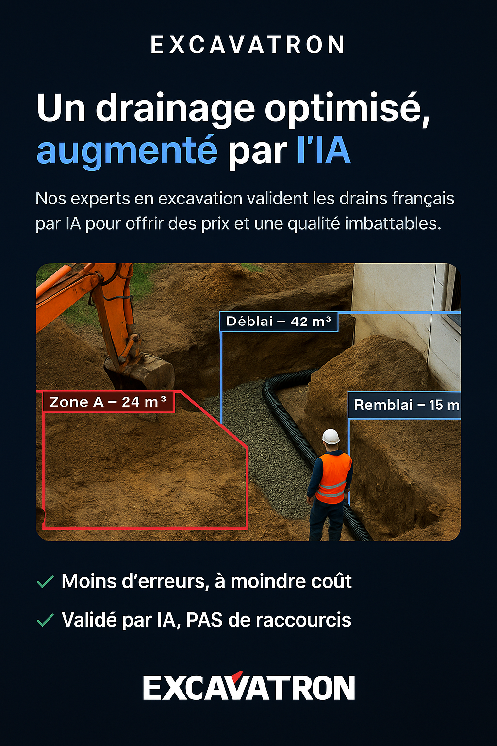 Excavation de précision • Estimation IA sans erreurs • Drains français durables • Réparation de fondations • Gestion complète de chantier